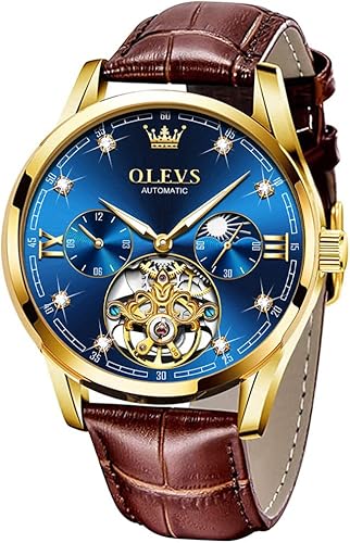 OLEVS Mens Leather Watches Automatic Mechanical Skeleton Tourbillon Diamond Luxury Self Winding Dress Wrist Watches Moon Phase Waterproof Luminous…